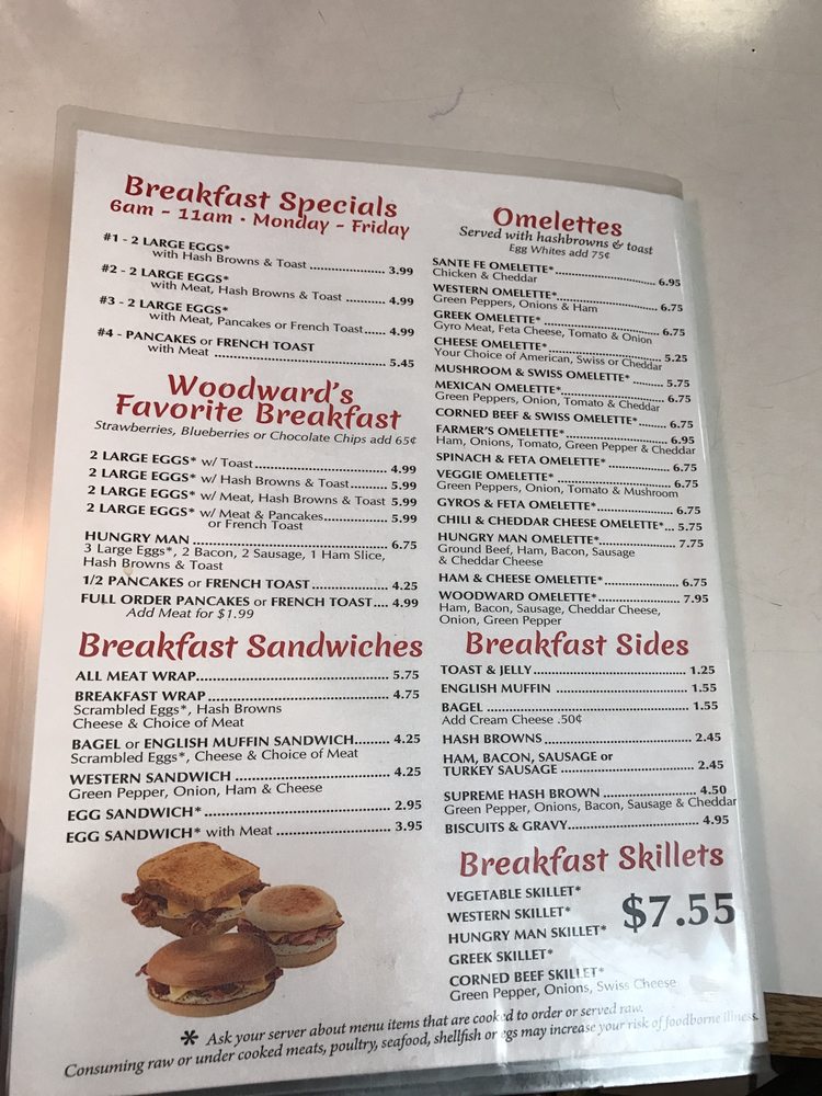 The menu features an array of hearty omelettes like the Woodward Omelette packed with ham, bacon, and cheddar, alongside tantalizing favorites such as tender chicken wings and crispy fish and chips. Don't miss their Gyro Platter or Chicken Stir Fry, both bursting with flavor. For a lighter bite, their fresh salads, including the Chicken Caesar and Gyro Greek Salad, offer delicious balance.